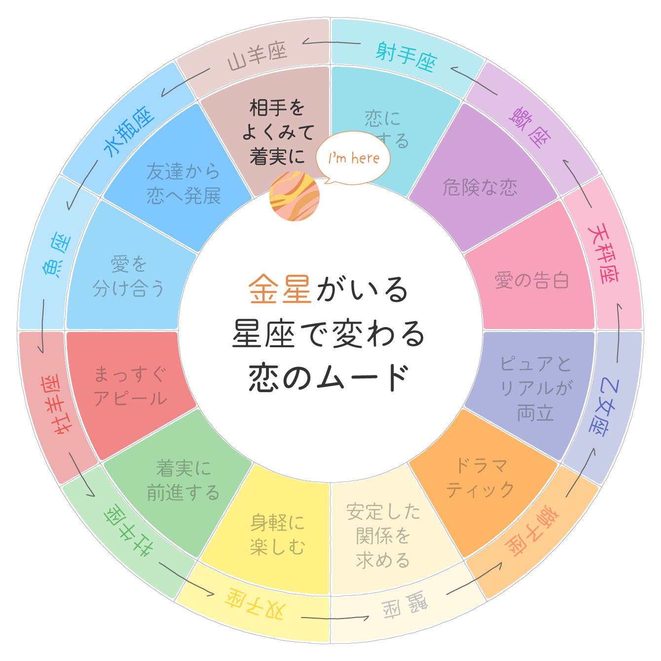 恋愛や楽しいことを司る「金星」の動きで、世の中全体の恋愛傾向や星座別の「恋愛運」を占います。
